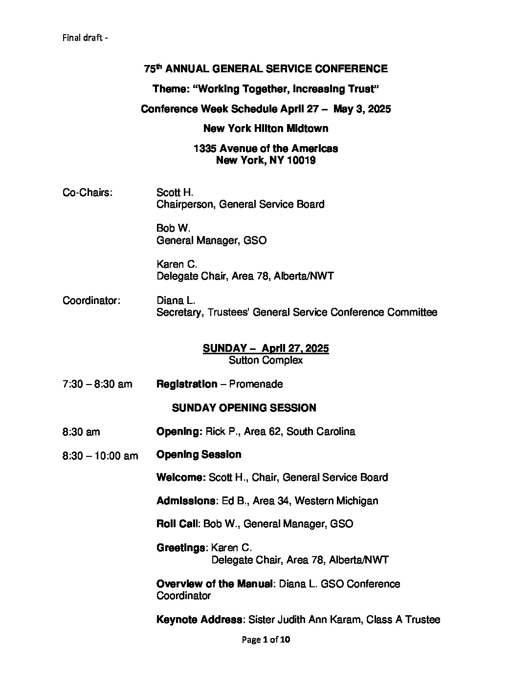¡Por fin ha llegado el día en que comienza la 75.ª Conferencia de Servicios Generales! Estaba impaciente por llegar a la sala de reuniones y encontrar un asiento. Cogí mi manual de la conferencia y rápidamente encontré un sitio donde sentarme. Hice algunas fotos que compartiré del cartel y de mi manual. Empezamos a las 8:32 y, tras la inauguración y algunos asuntos relacionados con la política y las admisiones, pasamos a la lista de asistentes. No, no lloré, pero fue muy emocionante. Nuestro delegado de la conferencia nos dio la bienvenida y, a continuación, el coordinador de la conferencia nos ofreció una visión general del manual. El discurso de apertura corrió a cargo de un miembro de clase A. Tenemos copias de los discursos. Empezamos con la mecánica de la conferencia y luego hicimos un descanso para ir a nuestros grupos de debate sobre el inventario. El almuerzo fue por regiones e inmediatamente después escuchamos a algunos grupos de inventario. Volvimos a repasar la mecánica de la conferencia y escuchamos un informe resumido de la Junta de Servicios Generales a cargo del presidente. Los aspectos más destacados de las regiones del suroeste y del Pacífico fueron muy informativos y casi todos lo hicieron muy bien en el tiempo previsto. Tuve la oportunidad de ver los 12 pasos, las 12 tradiciones y los 12 conceptos en los tres idiomas, la exposición de A A Grapevine y disfruté mucho de la exposición del archivo. La foto del archivo forma parte del resumen de la conferencia de 1965 y marqué su apellido en mi foto para que se pueda publicar. Eve M. era del condado de Broward. Después de un breve descanso, los miembros de la conferencia tuvimos nuestra cena de apertura y la reunión de AA con cinco ponentes: un custodio regional, dos delegados de área, el director de AA Grapevine y el editor de AAGV. Qué día tan completo. Mañana más…